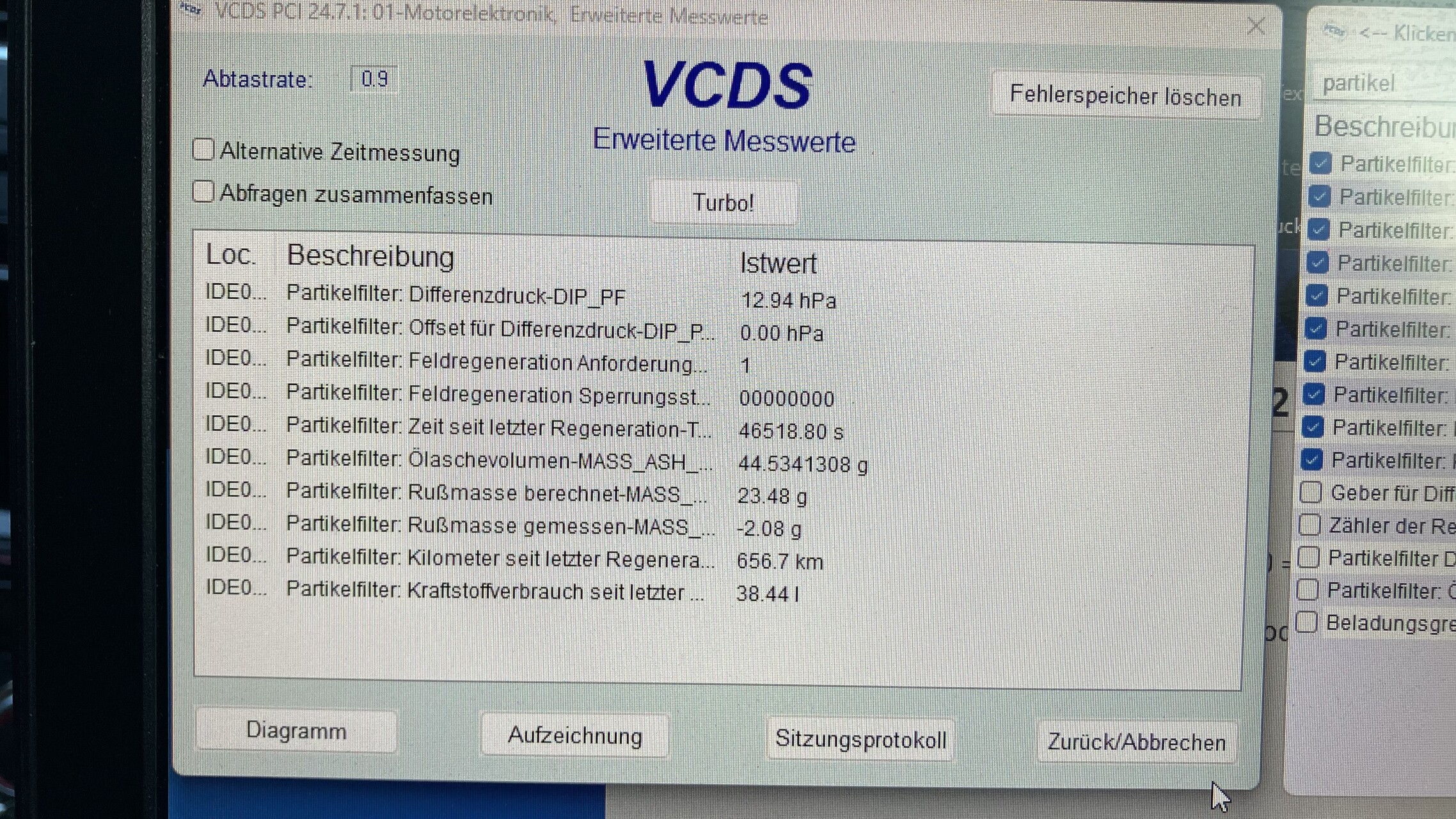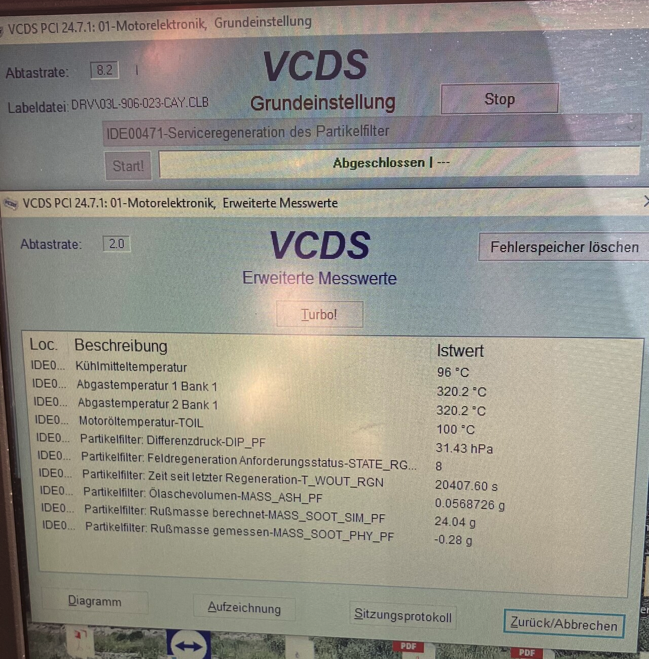 - Beladung Partikelfilter unter den Vorgaben (siehe MWB 108.2/3 -oder- 241.2/3 VCDS sollte hier die entsprechenden Werte anzeigen)