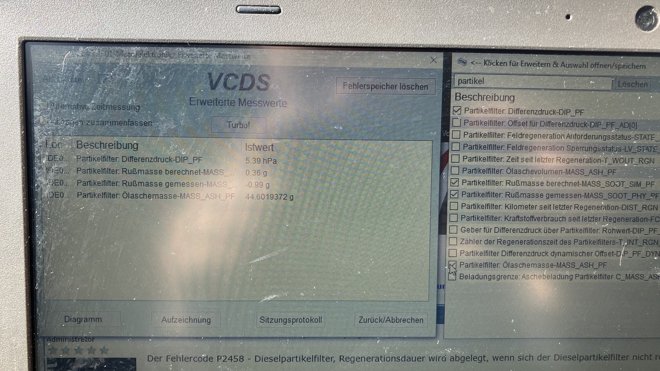 Nach dem Vorgang die folgenden Messwertblöcke kontrollieren. Die Beladung des Partikelfilter sollte nur sehr klein sein (entweder 0 % oder leicht drüber)