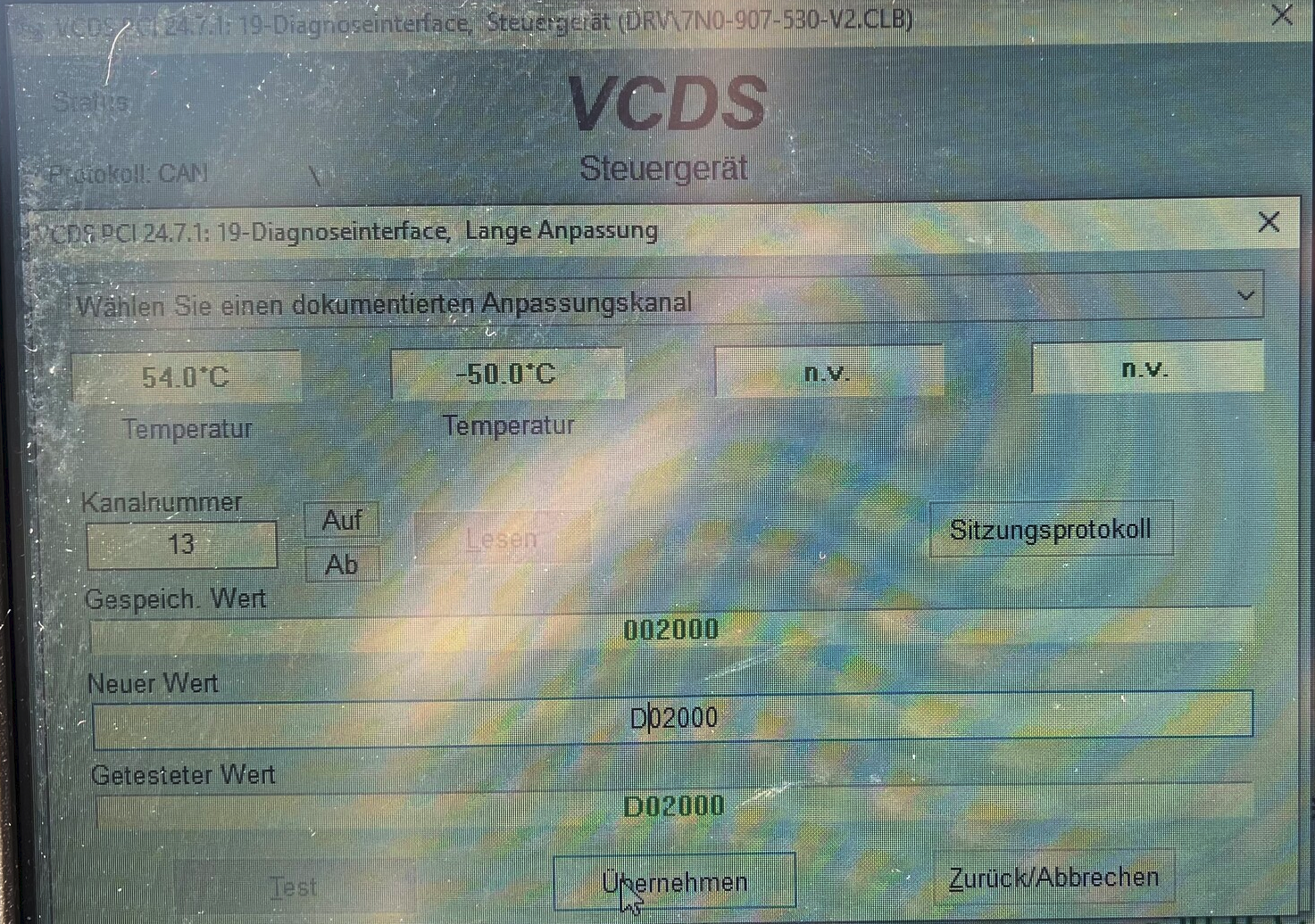 VCDS -> 19-Diagnoseinterface -> 0A-Lange Anpassung -> Kanalnummer 13 -> "D02000" -> Testen / Übernehmen"