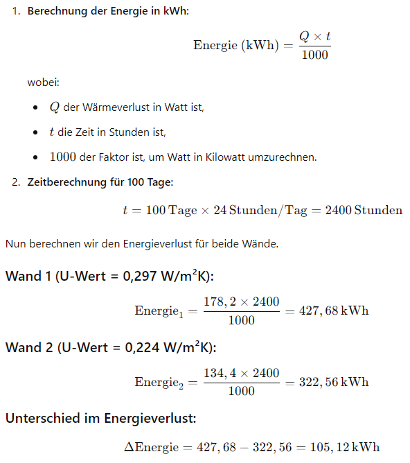 Um den Energieverlust über 100 Tage zu berechnen, müssen wir den Wärmeverlust (in Watt) in Kilowattstunden (kWh) umrechnen. Dazu verwenden wir folgende Schritte: