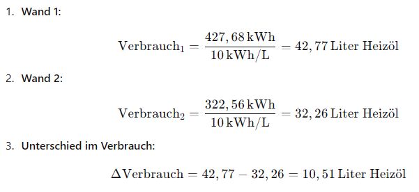 Das bedeutet, dass Wand 2 etwa 10,51 Liter Heizöl weniger benötigt als Wand 1 über 100 Tage mit einer konstanten Temperaturdifferenz von 20 Grad.