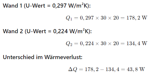 - Der Unterschied im Wärmeverlust zwischen den beiden Wänden beträgt 43,8 W.