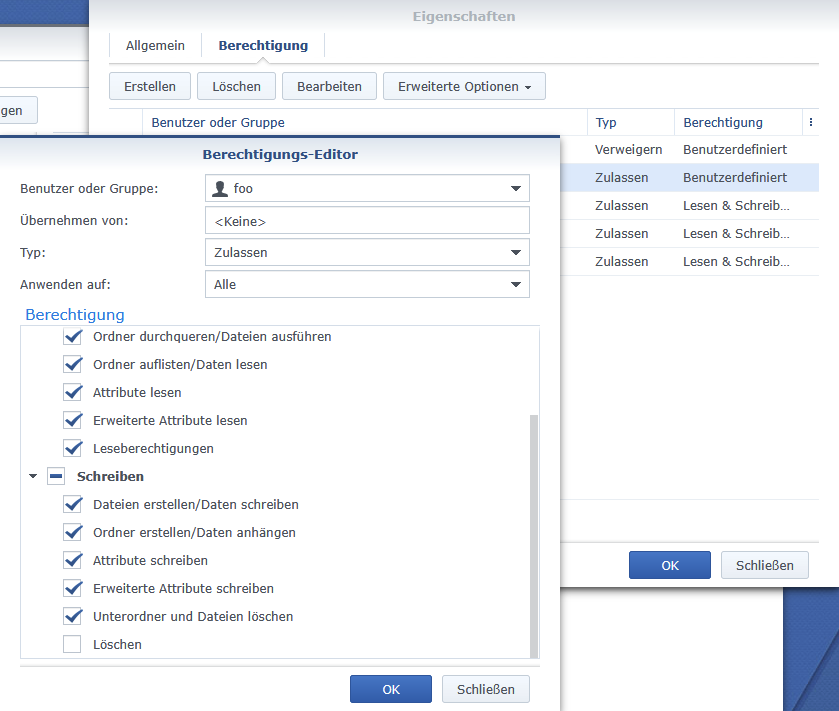 Die Berechtigung Löschen bedeutet "Diesen Ordner löschen".