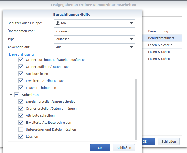 Demoordner ist eine Freigabe und FooOrdner ist der zu schützende Ordner. Sämtliche Dateien sollen gelöscht werden können.