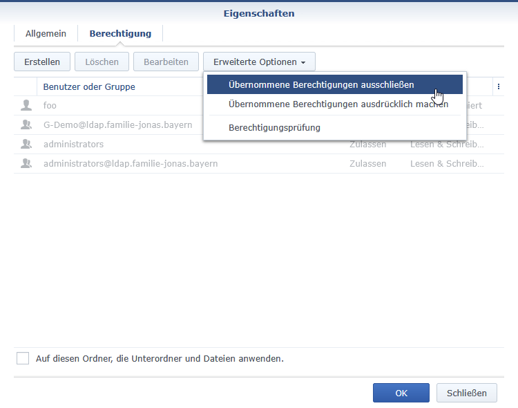 Beim zu schützenden Ordner FooOrdner müssen die Berechtigungen ausschließlich gemacht werden.
